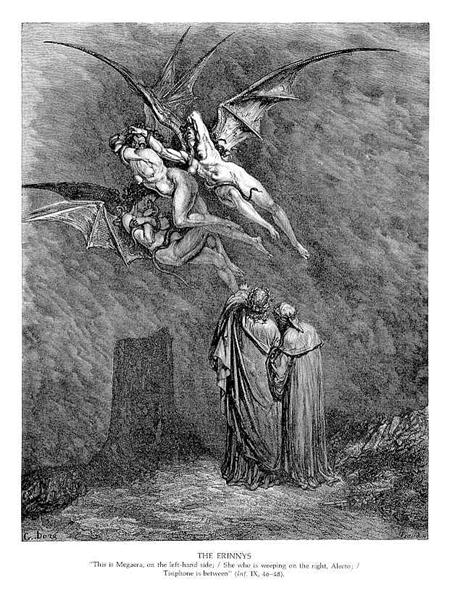 O poeta Esquilo, na peça Eumênides (versos 52-55) descreve as Erínias como morcegos em seu voo noturno e sinistro, trazendo um aspecto ameaçador para as deusas.