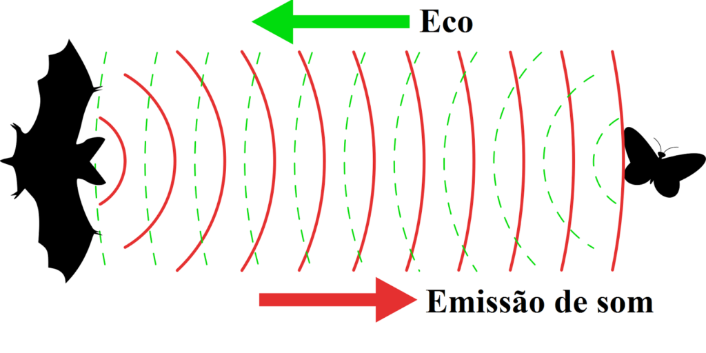 A ecolocalização é a emissão de sons de alta frequência por narinas e boca que, ao se chocar contra alguma superfície, retorna aos morcegos. Com isso, eles podem saber, por exemplo, se há uma árvore por perto, a que distância, qual o seu tamanho.