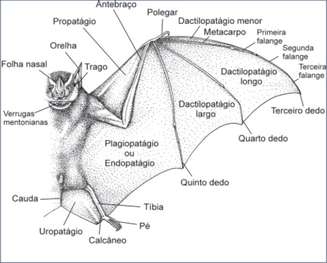 Estruturas do corpo de um morcego da família Phyllostomidae.
