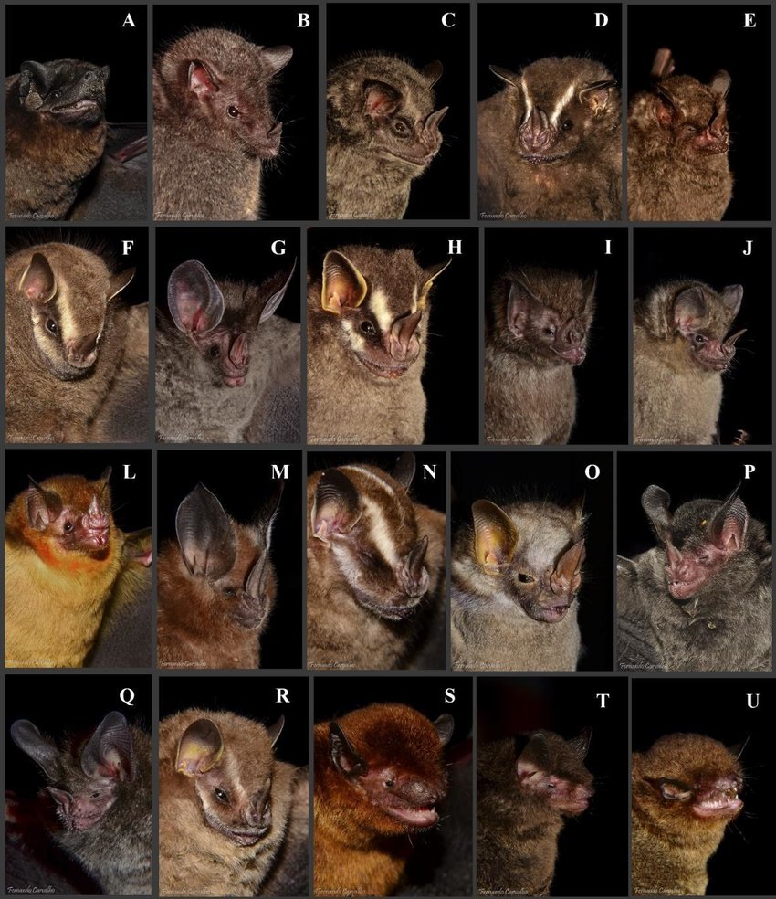 Algumas das espécies de morcegos: A – Molossus molossus; B – Anoura geoffroyi; C –Artibeus fimbriatus; D – Artibeus lituratus; E – Carollia perspicillata; F – Chiroderma doriae; G – Chrotopterus auritus; H – Dermanura cinerae; I – Desmodus rotundus; J – Glyphonycteris sylvestris; L – Lampronycteris brachyotis; M –Mimon bennettii; N – Plathyrrinus recifinus; O – Pygoderma bilabiatum; P – Tonatia bidens; Q – Trachops cirrhosus; R – Vampyressa pusilla; S – Eptesicus brasiliensis; T – Myotis riparius; U – Myotis ruber. Fonte: Fernando Carvalho.